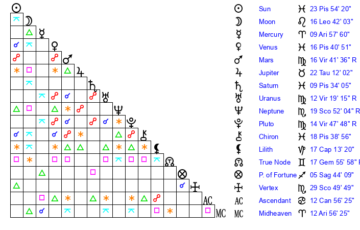 Mars | 16 Virgo 42 | 18 Cancer 59 | 11 Virgo 52 |