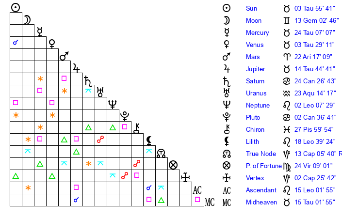 | Uranus | 23 Aquarius 11 | 25 Taurus 59 | 21 Aquarius 51 |
