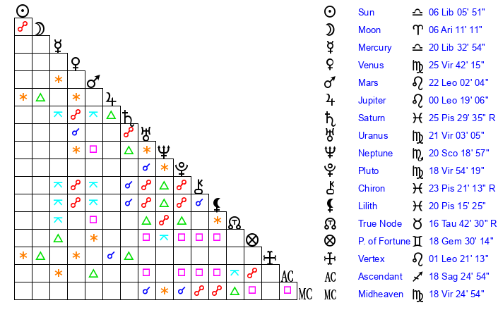 Pluto | 18 Virgo 55 | 1 Aquarius 24 | 20 Virgo 28 |