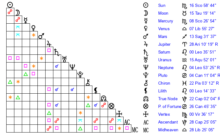 | Sun | 16 Scorpio 58 | 17 Scorpio 47 | 6 Pisces 32 |