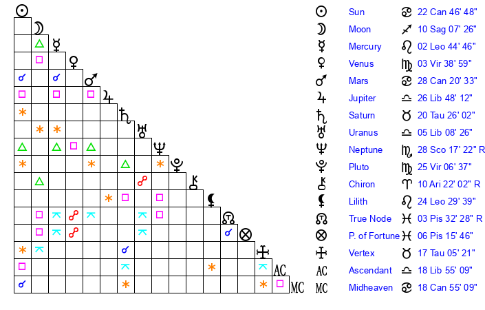 Sun | 22 Cancer 47 | 23 Cancer 27 | 15 Virgo 37 |