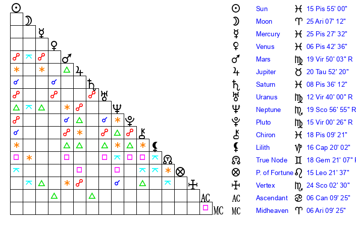Moon | 25 Aries 12 | 16 Gemini 40 | 11 Cancer 3 |