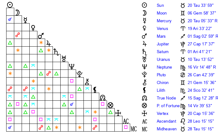| Mercury | 20 Taurus 5 | 2 Taurus 3 | 9 Virgo 55 |