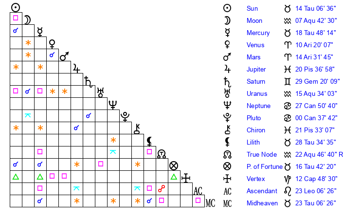 | Uranus | 15 Aquarius 31 | 26 Taurus 36 | 12 Aquarius 59 |