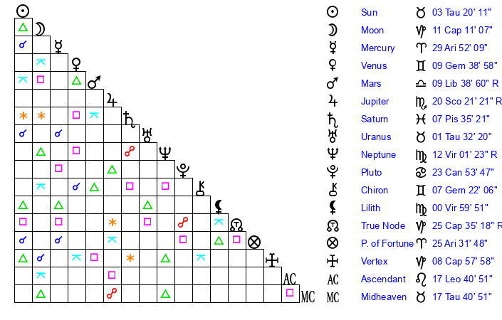 | Moon | 11 Capricorn 12 | 17 Pisces 38 | 7 Taurus 48 |
