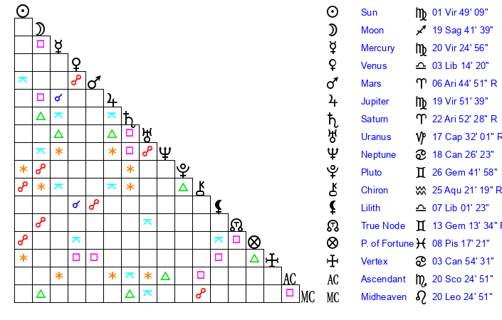 | Sun | 1 Virgo 49 | 2 Virgo 45 | 27 Sagittarius 11 |