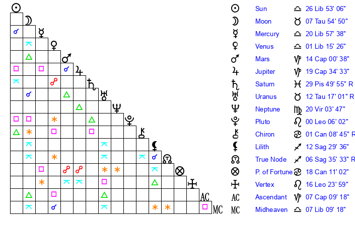 | Sun | 26 Libra 53 | 27 Libra 33 | 25 Capricorn 55 |