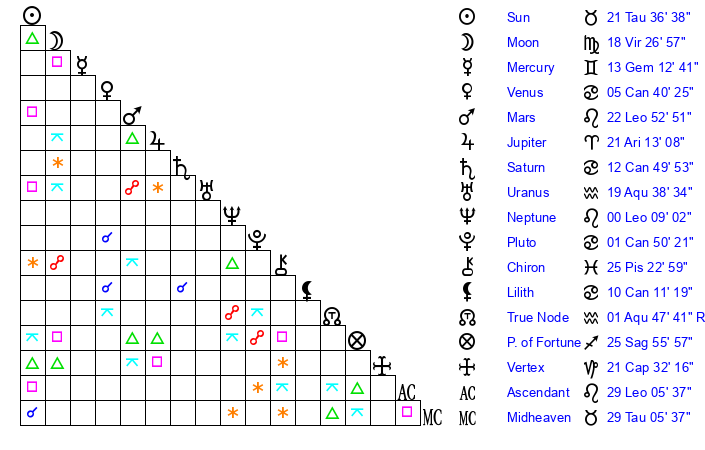 | Sun | 21 Taurus 36 | 22 Taurus 13 | 5 Virgo 59 |