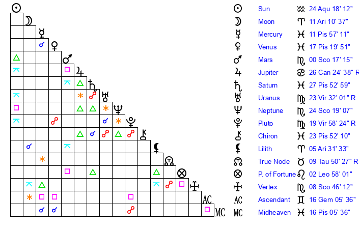 Mercury | 11 Pisces 57 | 28 Aquarius 33 | 27 Pisces 14 |