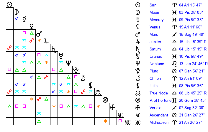 | Saturn | 4 Libra 59 | 23 Pisces 39 | 2 Libra 23 |
