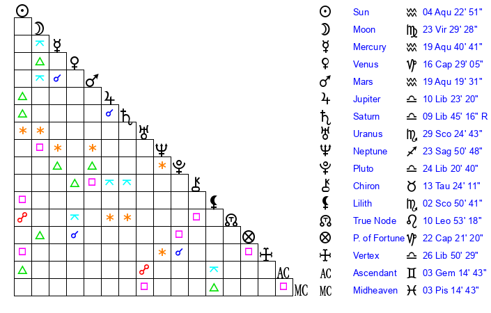 | Sun | 4 Aquarius 23 | 4 Aquarius 42 | 18 Pisces 47 |