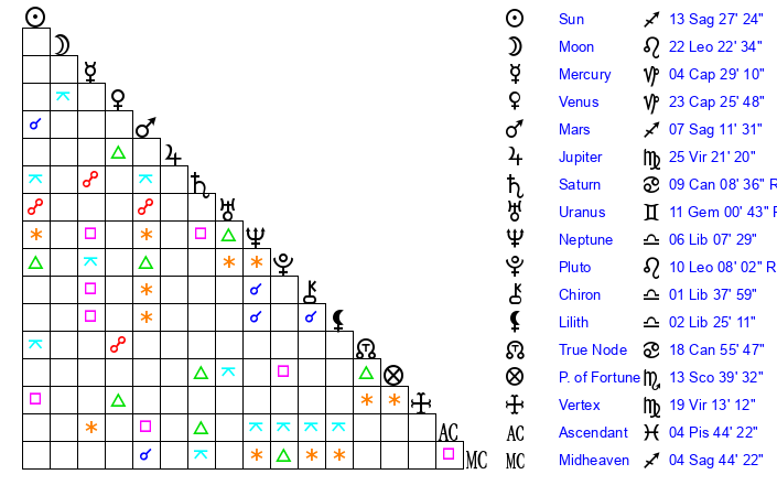 | Moon | 22 Leo 23 | 24 Gemini 18 | 9 Leo 48 |