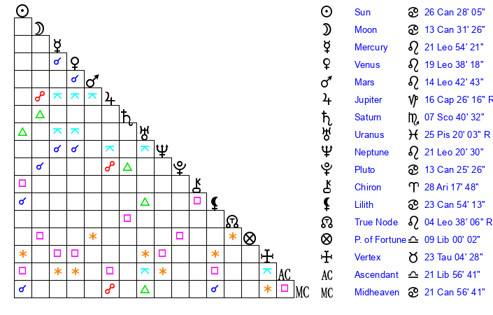 | Sun | 26 Cancer 28 | 27 Cancer 16 | 3 Scorpio 46 |