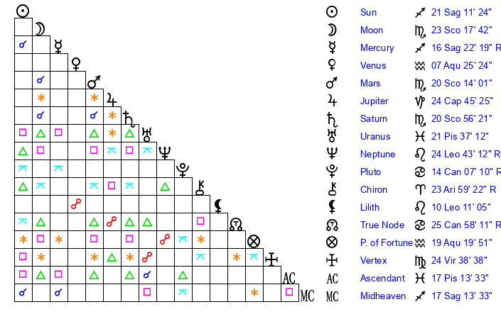 | Saturn | 21 Scorpio 24 | 13 Pisces 19 | 26 Scorpio 21 |