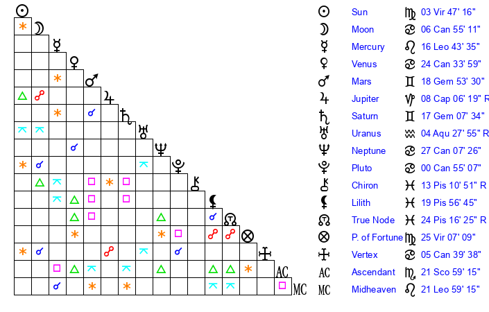| Venus | 24 Cancer 34 | 2 Leo 25 | 11 Sagittarius 45 |