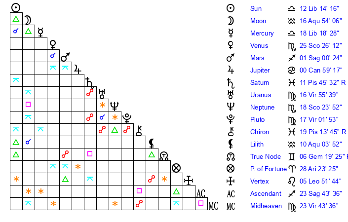 Moon | 16 Aquarius 57 | 22 Pisces 50 | 21 Aries 48 |