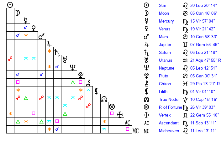| Neptune | 5 Leo 13 | 1 Aries 45 | 7 Leo 0 |