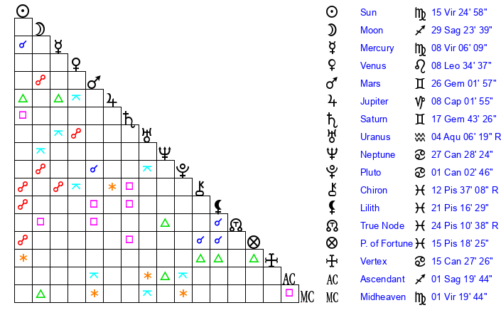 | Sun | 15 Virgo 25 | 16 Virgo 18 | 7 Capricorn 24 |