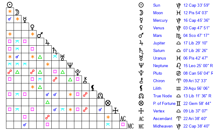 | Venus | 3 Capricorn 48 | 0 Pisces 36 | 12 Taurus 24 |