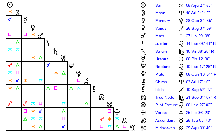 | Sun | 5 Aquarius 27 | 7 Aquarius 0 | 19 Taurus 42 |