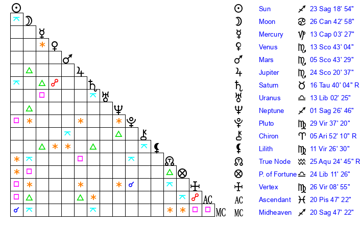 Sun | 23 Sagittarius 19 | 24 Sagittarius 13 | 18 Aquarius 16 |