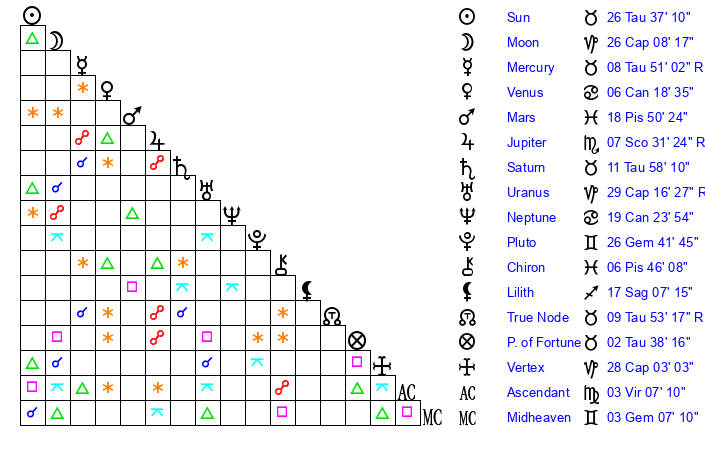 Sun | 26 Taurus 37 | 28 Taurus 0 | 15 Virgo 53 |