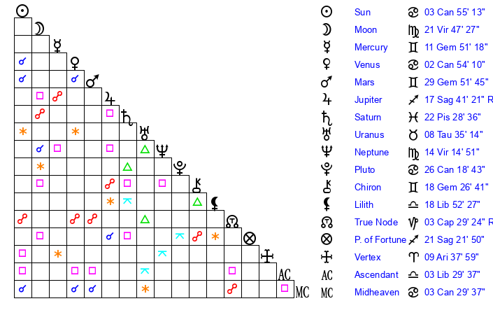 | Moon | 21 Virgo 53 | 8 Cancer 1 | 15 Sagittarius 47 |