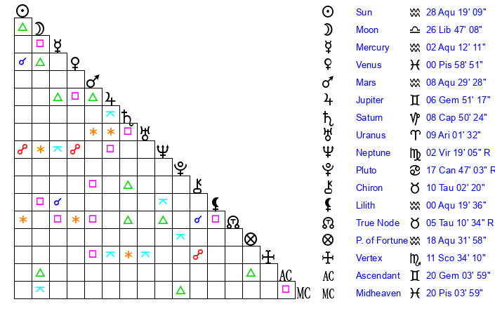 | Sun | 28 Aquarius 19 | 29 Aquarius 17 | 1 Gemini 49 |