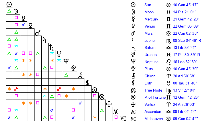 | Pluto | 10 Cancer 43 | 3 Aquarius 4 | 12 Cancer 22 |