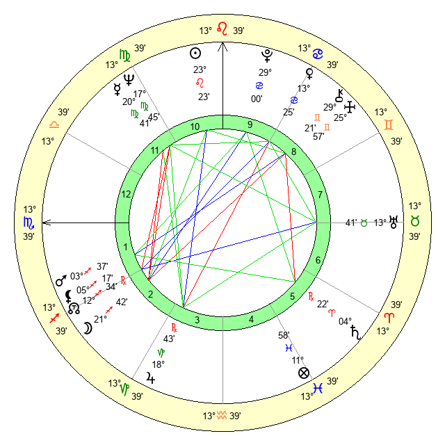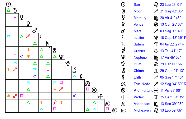 | Sun | 23 Leo 23 | 24 Leo 5 | 19 Scorpio 54 |