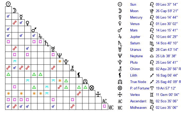 | Pluto | 25 Leo 54 | 2 Aquarius 22 | 28 Leo 0 |