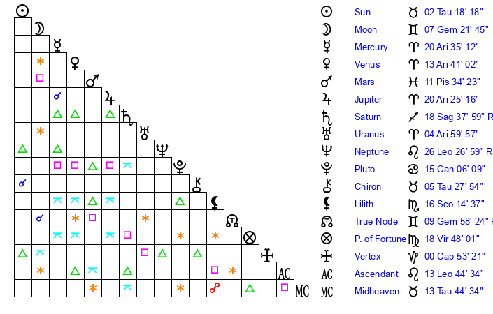 | Sun | 2 Taurus 18 | 2 Taurus 49 | 5 Leo 20 |
