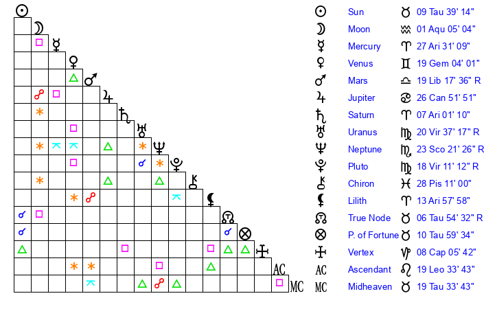 Uranus | 20 Virgo 41 | 26 Taurus 19 | 20 Virgo 44 |