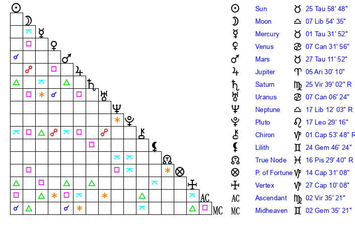 | Sun | 25 Taurus 58 | 27 Taurus 2 | 6 Leo 43 |