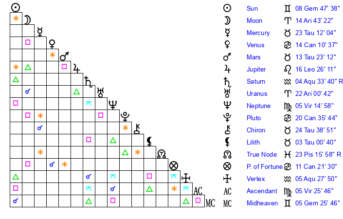 | Moon | 14 Aries 40 | 24 Cancer 44 | 2 Virgo 55 |
