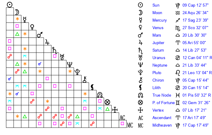 | Moon | 24 Aquarius 14 | 19 Capricorn 58 | 15 Libra 49 |