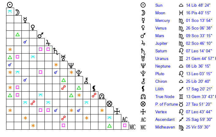 | Sun | 14 Libra 48 | 15 Libra 40 | 4 Capricorn 20 |
