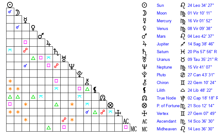 | Mercury | 16 Virgo 2 | 6 Leo 39 | 19 Scorpio 58 |