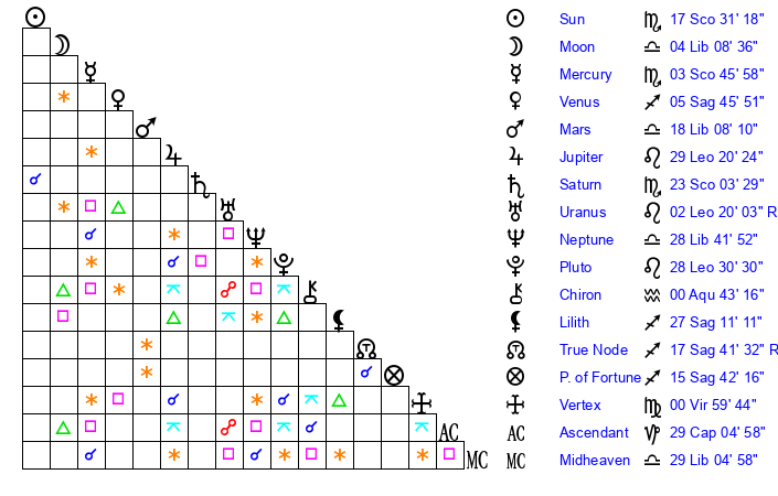Neptune | 28 Libra 42 | 27 Pisces 19 | 0 Scorpio 22 |