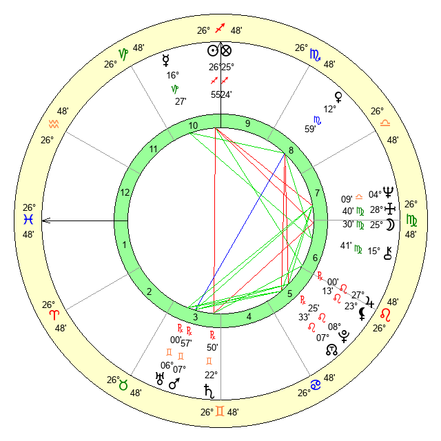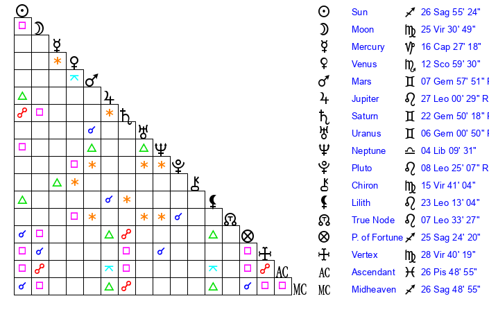 | Moon | 25 Virgo 25 | 24 Sagittarius 4 | 27 Virgo 33 |