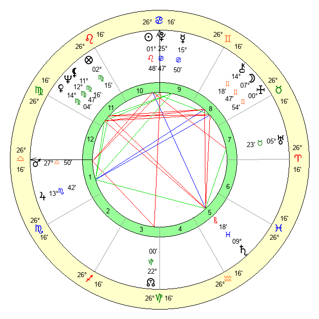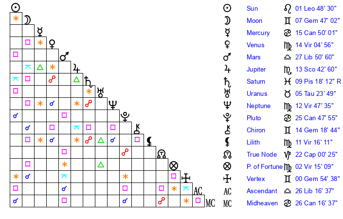 | Moon | 7 Gemini 42 | 14 Leo 26 | 18 Virgo 21 |