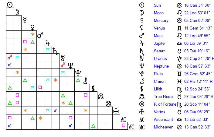 | Neptune | 18 Cancer 58 | 2 Aries 9 | 21 Cancer 33 |