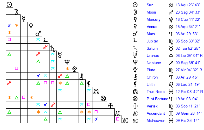 Pluto | 27 Virgo 4 | 2 Aquarius 6 | 25 Virgo 42 |