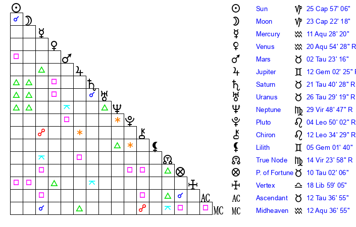 | Mercury | 11 Aquarius 29 | 12 Capricorn 9 | 8 Aries 7 |