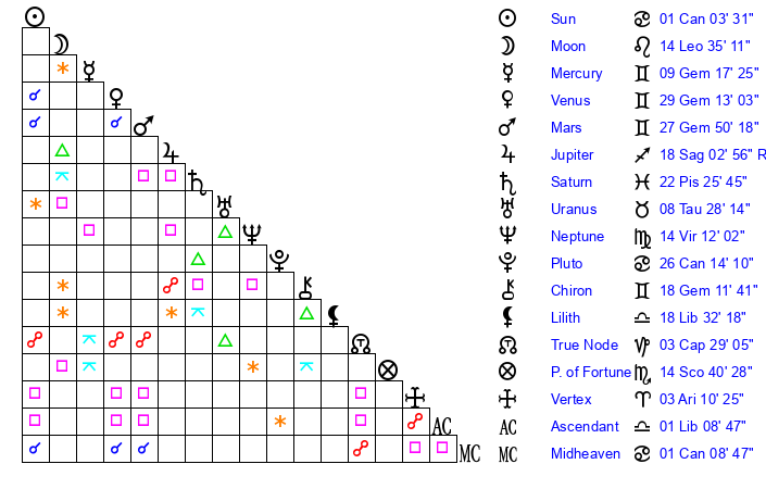 | Mars | 27 Gemini 50 | 3 Virgo 1 | 25 Leo 40 |