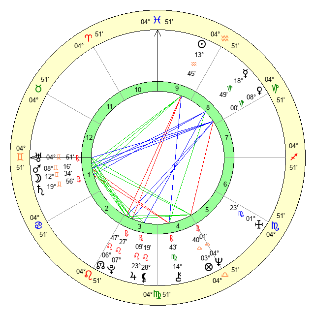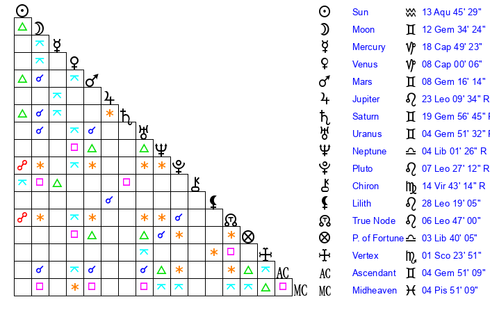| Moon | 12 Gemini 36 | 23 Aries 41 | 28 Taurus 52 |