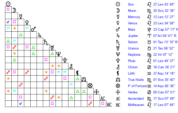 | Moon | 25 Scorpio 39 | 9 Leo 47 | 16 Capricorn 11 |