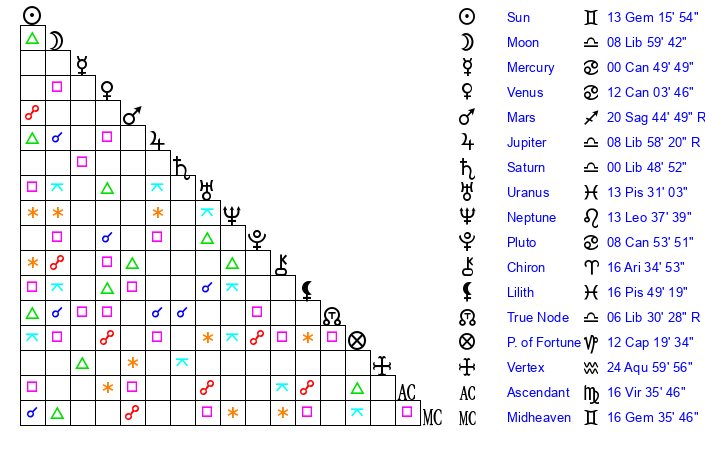 | Sun | 13 Gemini 16 | 14 Gemini 19 | 22 Virgo 3 |