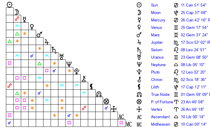 | Moon | 25 Capricorn 37 | 3 Scorpio 40 | 10 Sagittarius 2 |