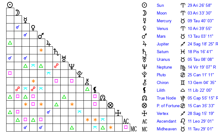 | Venus | 10 Aries 40 | 25 Pisces 29 | 29 Cancer 57 |